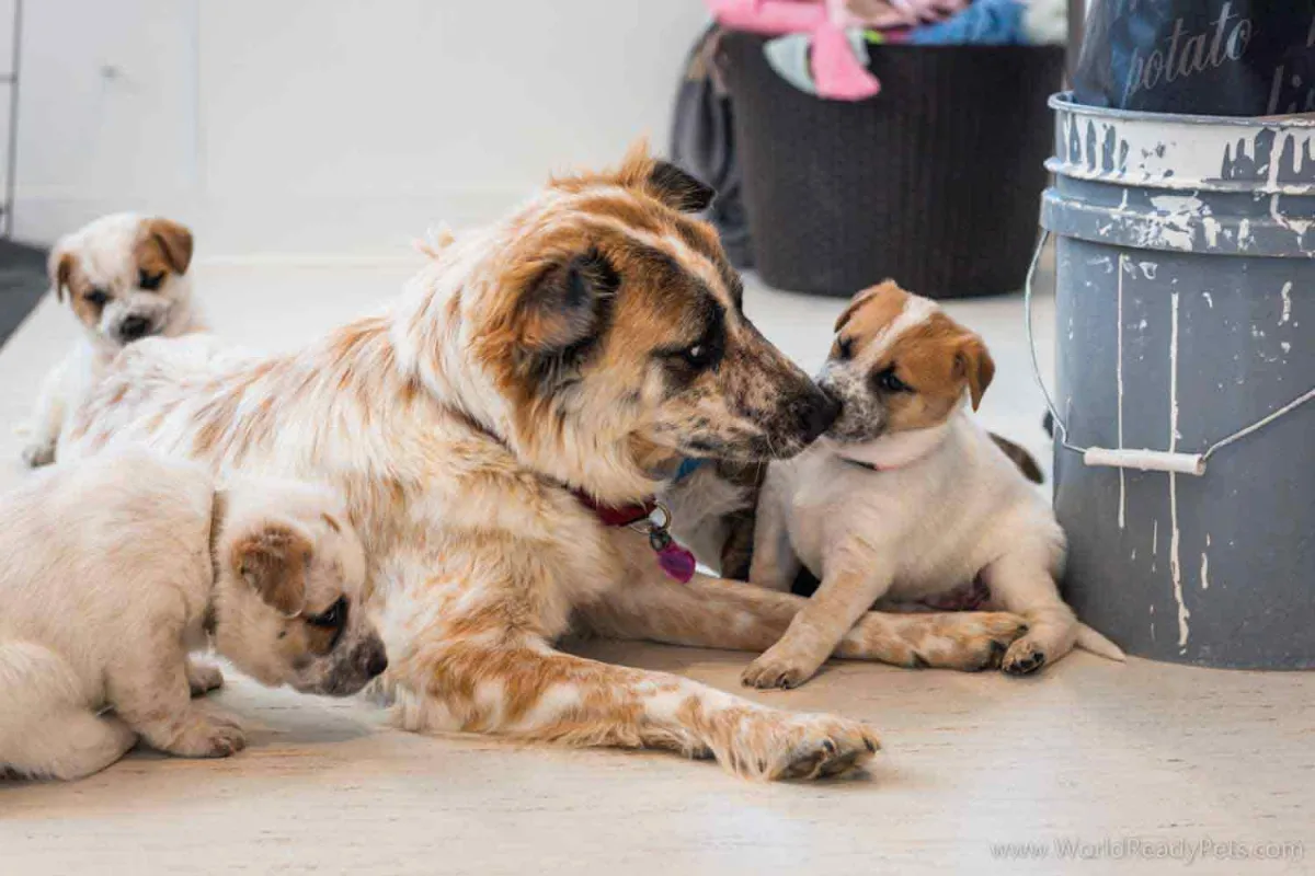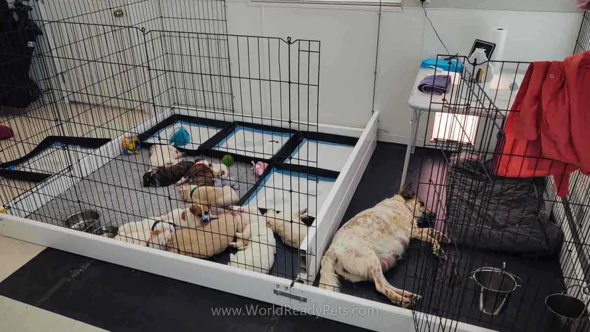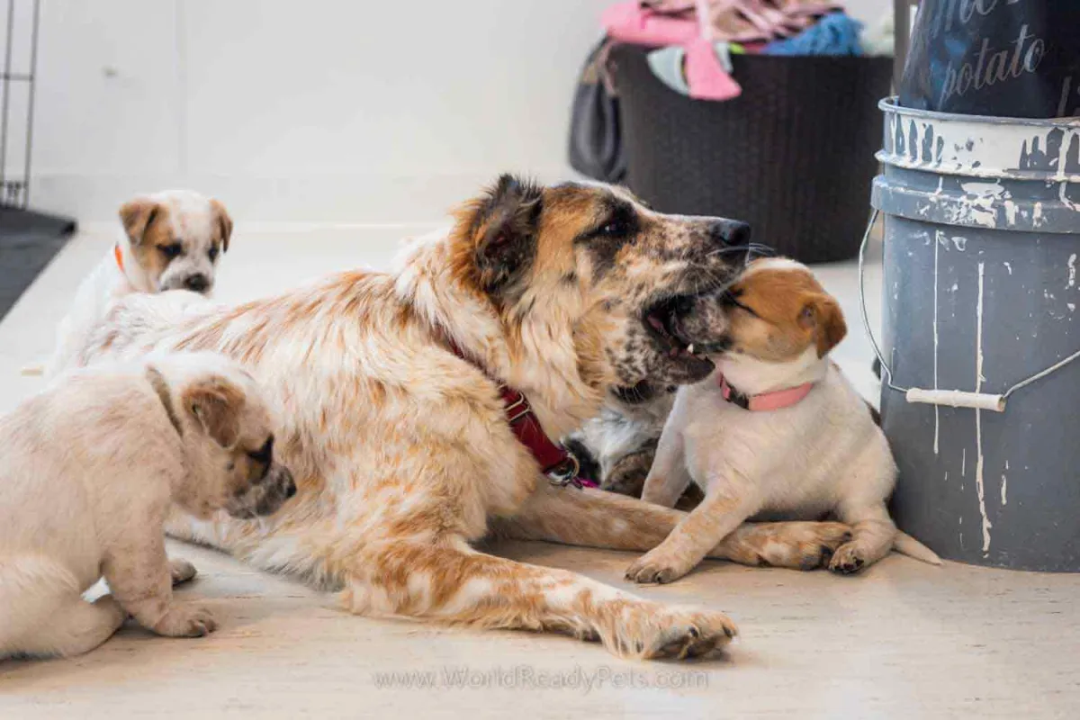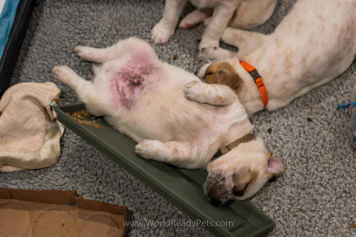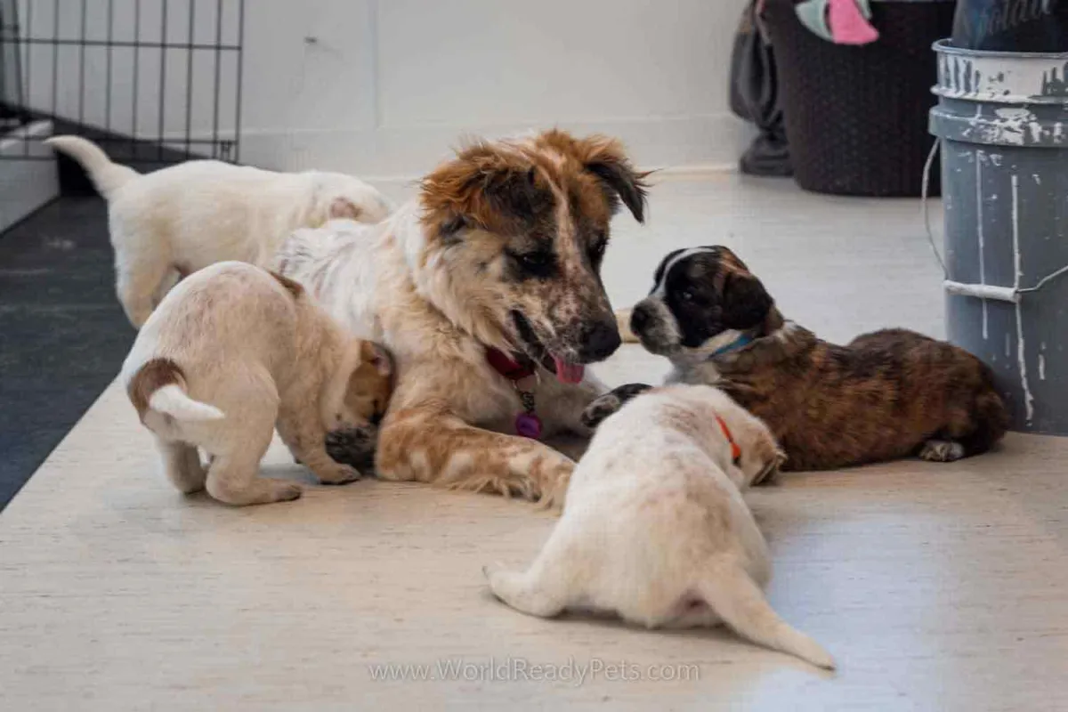 Maggie has started to play a little with her puppies. She’s so cute and gentle. I showed the puppies the dog door this week and after the first day, they barely wanted to come inside. We’re having a mild spring so it’s still nice and cool out there and they love it. They’re starting to look and act more like little dogs now that they are a little more coordinated.